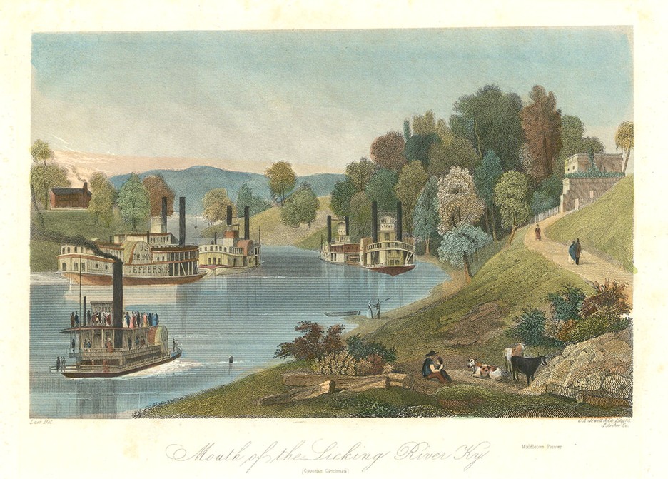In 1803, the Newport Barracks was built to the east of the Licking River’s mouth where a steam-driven sawmill had fostered a strong lumber industry, and by 1850, river trade had swelled the community to nearly 6000 (Webster 121-2). Immediately south of Cincinnati lay the populace Boone county. Mills and iron works drew on the waters of Licking and lined its banks as the shores of Ohio came into sight (137). Covington’s emerging iron and meatpacking industries drew settlers and businesspeople whose homesteads and businesses would have overlooked the mouth of Licking and any who travelled its waters. (Tenkotte and Claypool 548).